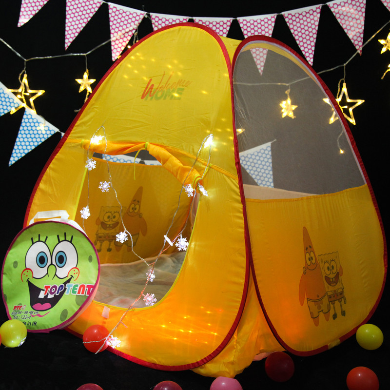 کلبه ای مخصوص به کودک، کارکردی فراتر از یک اسباب بازی معمولی برای کودکان ما دارد. این کلبه جایی برای تجربه های نخستین حس استقلال ، مالکیت و خودمختاری در کنار حمایت خانواده است. در اینجا می تواند ساعتها با اسباب بازی های خود مشغول به بازی شود یا حتی دوستان یا پدر و یا مادر خود را مهمان خانه کوچک خودش کند. چادر بازی تاپ تنت سایز یک (در طرح باب اسفنجی) تهیه شده از پارچه پلی استر و تور با کیفیت و فنر فلزی قوی که با افتخار توسط تولیدکننده ایرانی (تولیدی پیتیکو) تولید و عرضه می شود با داشتن چاپ های زیبا و بادوام فضایی زیبا و انرژی بخش برای زمان استراحت و بازی کودک فراهم می کند. باز و بسته شدن آسان این محصول و کیف حمل با کیفیت آن ( دایره ای به قطر حدود 40 سانتی متر) به والدین عزیز این امکان را می دهد که از این چادر در منزل یا گردش های خانوادگی استفاده کنند. ضمن اینکه این فضا، به والدین در جمع آوری اسباب بازی ها، عروسک ها و وسایل کودک کمک می کند. تور با کیفیت به کارگرفته شده در اطراف و پشت چادر تنفس و نور مناسب را برای کودک فراهم می کند. جنس پارچه به گونه ای انتخاب شده است که به آسانی کثیف نمی گردد. واحد کنترل کیفیت تولیدی پیتیکو قبل از ارسال نسبت به کنترل دوخت ، فنر زنی و چاپ اقدام می نماید. کناره های این چادر شامل 45 سانت پارچه و 55 سانت تور و پشت این چادر شامل 40 سانت پارچه و 60 سانت تور می باشد.