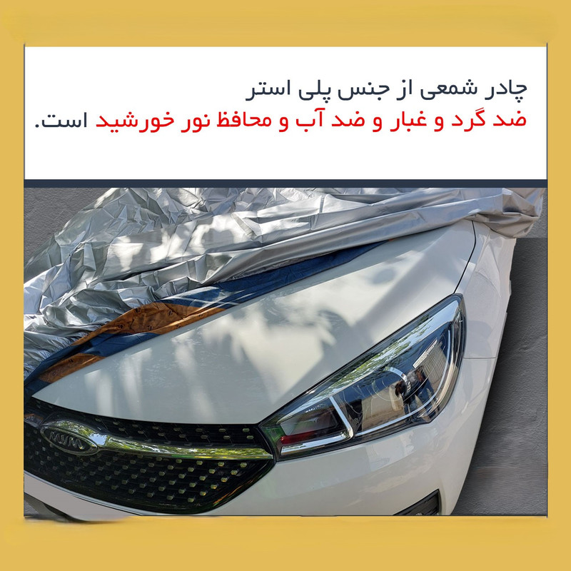 سایر توضیحات: - وزن فوق سبک - بازتاب دهنده نور خورشید - جلوگیری از داغ شدن بیش از اندازه داخل خودرو - دوخته شده از پارچه شمعی - غیرقابل نفوذ در برابر آب -محافظت خودرو از اشعه های مضر uv خورشید -جلوگیری از ایجاد آثار مخرب روی رنگ و بدنه خودرو