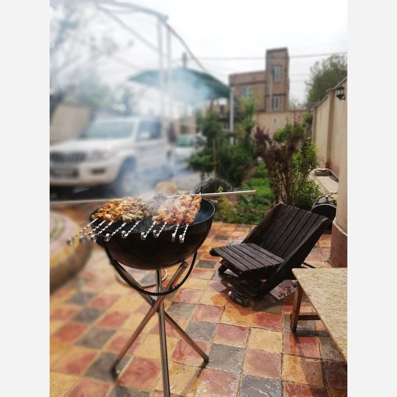 جنس روکش آتشدان لعاب سرامیکی نسوز بوده که تنها پوششی است که برای خانواده منقلها از بین نمی رود و قابلیت شستشو و پخت وپز را نیز دارد. این آلیاژ از بهترین پوششهای ضد خوردگی محسوب میشود و در عین زیبایی و درخشش منحصربهفرد، مقاومت بسیار بالا در برابر حرارت و دمای زیاد، پوسته پوسته شدن و خراشیدگی دارد و یک پوشش مقاوم و عالی است که باعث افزایش طول عمر و ماندگاری طولانی مدت آتشدان میشود. جنس آتشدان فولاد فنر می باشد که در صورت تاب برداشتن بعد از استفاده با نیروی بسیار کم به حالت اول برمیگردد. یک پایه سه بعدی کوتاه نیز در برای این آتشدان در نظر گرفته شده است که کارایی آن را افزایش می دهد. قطر آن حدود 57 تا 60 سانتی متر بوده و با پایه بلند در هر جایی قابل استفاده است. پایه آن از جنس استیل با قطر 10 میلی متر ساخته شده است. در این پک ابزارهای زیر عرضه می شود: کاسه لعاب دار سه عدد پایه، رابط و فنر داخل کیف توری گردش هوا توری گریل لولادار کیف حمل سایر مشخصات قطر:حدود 57 تا 60 سانتی متر وسیلهای کاربردی با طراحی همهکاره مناسب برای درست کردن آتش و پختوپز قابل استفاده در سفر، طبیعتگردی، کمپینگ و … قابل برپایی و استفاده در تمامی فضاها و مکانهای باز مانند حیاط یا تراس خانههای آپارتمانی و ویلایی، باغ، ساحل و … مقاومت بالای فلز به کار رفته قابل استفاده در تمام فصول سال جنس آتشدان: فولاد فنر دارا بودن عنصر سیلیکون در آلیاژ فولادی آتشدان طبخ غذا با توری گریل لولا دار یک توری لولادار دقیقا هم اندازه سطح آتشدان گریل و کباب پز کردن انواع غذا و خوراکی مانند گوشت، مرغ، ماهی، انواع سبزیجات، همبرگر، استیک، هاتداگ، قارچ و … ارتفاع: 85 سانت قابلیت تنظیم کاسه به حالت 45 درجه برای تعداد کم آبکاری نیکل شده پایه ها