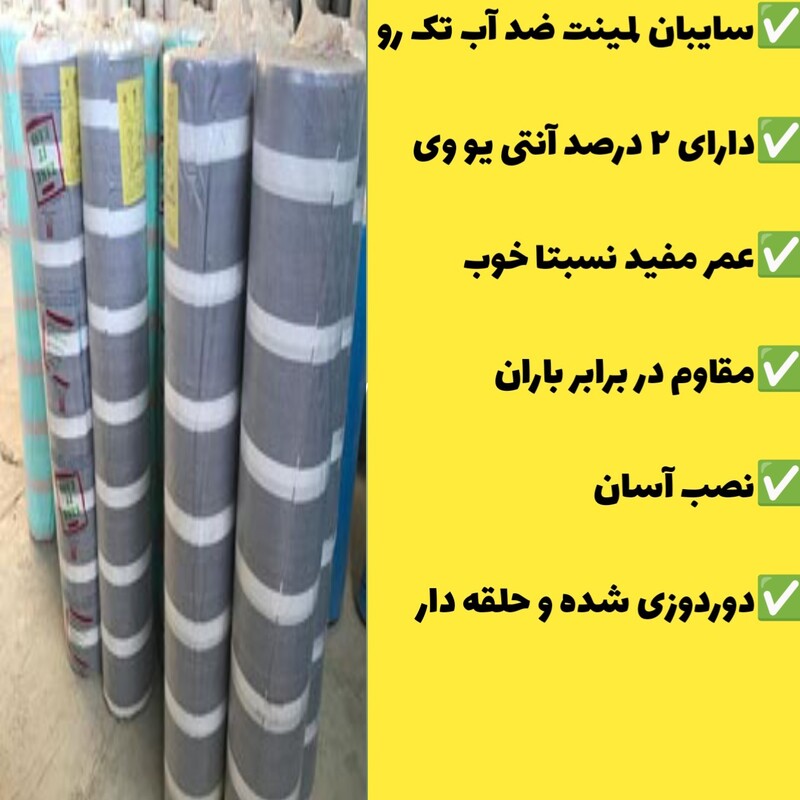 ✅سایبان لمینت ضد آب تک رو ✅دارای ۲ درصد آنتی یو وی ✅عمر مفید نسبتا خوب✅سایبان لمینت ضد آب تک رو ✅دارای ۲ درصد آنتی یو وی ✅عمر مفید نسبتا خوب ✅مقاوم در برابر باران ✅نصب آسان ✅دوردوزی شده و حلقه دار ✅مقاوم در برابر باران و برف ✅نصب آسان ✅دوردوزی شده و حلقه دار