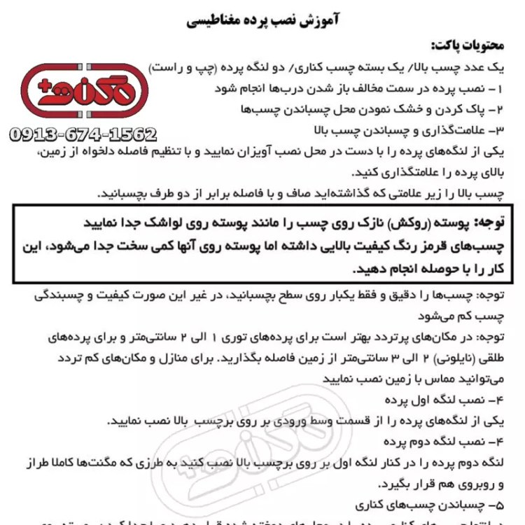 ✖لطفا قبل از سفارش محصول، توضیحات را به دقت مطالعه نمایید✖ ✅قبل از ثبت سفارش حتما در قسمت گفتگو ابعاد درخواستی را ارسال نمایید تا قیمت دقیق محصول اعلام شود ✅زمان آمادهسازی ابعاد سفارشی بر حسب حجم سفارشات ۳ الی ۷ روز کاری زمان میبرد ✔پرده توری مغناطیسی تهیه شده از تور فایبرگلاس نسوز 120 گرمی درجه 1 ✔مقاوم در برابر تابش آفتاب و پوسیدگی ✔رنگ خود تور نوک مدادی بوده و نوار دور تور مشکی رنگ ✔استفاده از چسبهای دوطرفه درجه 1 ✔نصب بدون نیاز به ابزار جانبی ✔قابل نصب روی درب تراس منازل، درب سکوریت فروشگاهها و ... ✔چسبهای دوطرفه همراه محصول میباشد و نیاز به هیچ ابزار جانبی نمیباشد ✔در صورت نیاز به آموزش برای اندازهگیری در قسمت گفتگو پیام دهید