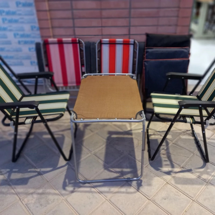 ست ۵ تیکه ۴عدد صندلی و یک میز فنری تاشو مخصوص مسافرت و کمپینگ لوله ۷۰*۲۰ در دو رنگ نقره ای و مشکی الکترواستاتیک رویه برزنت درجه یک با سه ردیف دوخت محکم همگی کار ها دارای کاور میباشد رنگ میز ها دو رنگ رزشکی و خردلی میباشد جهت سفاش رنگ میز خود را اعلام فرمایید در انتخاب رنگ دقت فرمایید