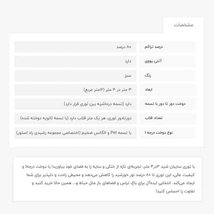 توری سایبان شید، 3در4، 80 درصد، دوخت درجه1