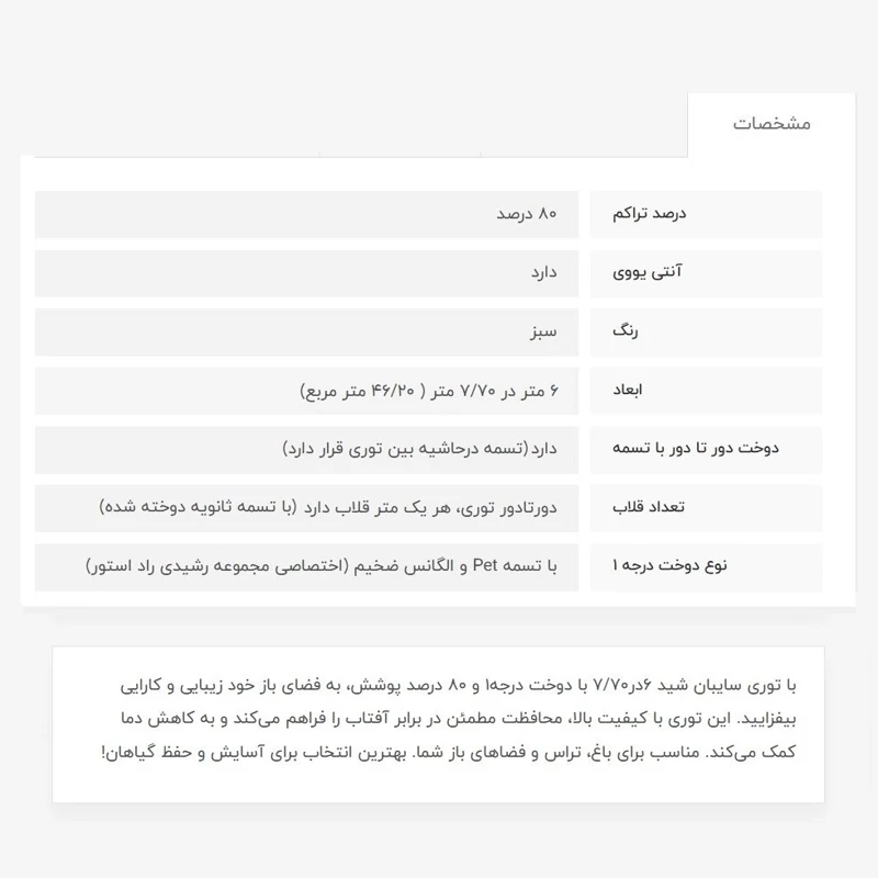 توری سایبان شید، آنتی یووی دار بوده که از اشعه خطرناک خورشید جلوگیری میکند و دربرابر آفتاب مقاومت بالایی دارد. دوخت درجه 1 (منظور تسمه و دوخت بسیار قویتر میباشد)، یک تسمه محکم دورتا دور توری، و هر متر یک قلاب با تسمه ثانویه دوخت خورده است. توری سایبان شید، برخلاف برزنت، هوا را خف نمیکند و هوا در جریان هست و وزن سبکی دارد که دیگر نیازی به سازه سنگین برای نصب، مثل برزنت ندارد. همچنین ارزان تر و با دوام تر است. تراکم توری 80 درصد بوده که یعنی 80 درصد جلوی نور خورشید را میگیرد، در واقع سایه دهی آن حداقل 80 درصد است. این میزان سایه برای بخش عمده نیاز افراد کاربرد دارد، مثل سایه برای خودرو، استخر، حیاط و ... حتی برای گل و گیاهان هم، جلوی سوختگی برگ ها در بهار و تابستان میگیرد ، در زمستان، برای برخی گیاهان، باعث کاهش رشد میشود ولی خرابی گیاه را در پی ندارد.