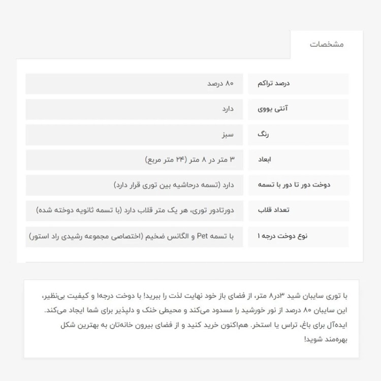 توری شید، 3در8، 80 درصد انتی یووی دار میباشد که از اشعه خطرناک خورشید جلوگیری میکند، دوخت درجه 1 (منظور تسمه و دوخت بسیار قویتر میباشد) ، تسمه محکم دور کار و هر متر یک قلاب با تسمه ثانویه دوخت خورده، این محصول اماده هست. این ابعاد اماده و بسته بندی شده هست، زمان تحویل به پست، بسته به زمان ثبت سفارش، بین 1 تا 3 روز میباشد