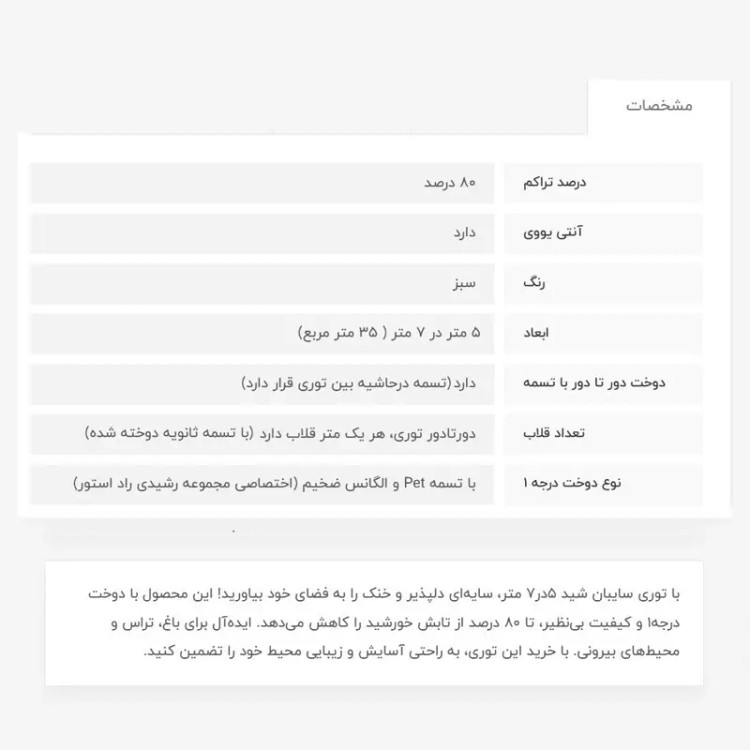 توری شید، 5در7، 80 درصد انتی یووی دار میباشد که از اشعه خطرناک خورشید جلوگیری میکند، دوخت درجه 1 (منظور تسمه و دوخت بسیار قویتر میباشد) ، تسمه محکم دور کار و هر متر یک قلاب با تسمه ثانویه دوخت خورده، این محصول اماده هست. این ابعاد اماده و بسته بندی شده هست، زمان تحویل به پست، بسته به زمان ثبت سفارش، بین 1 تا 3 روز میباشد.