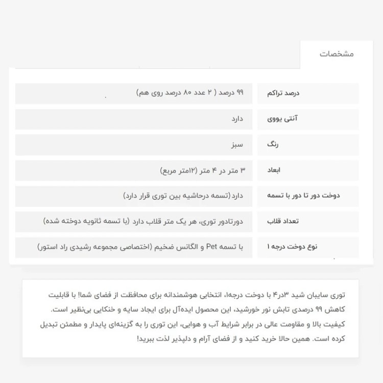 توری سایبان شید، 99 درصد پلاس (منظور 2 تا توری 80 درصد روی هم میباشد) انتی یووی دار بوده که از اشعه خطرناک خورشید جلوگیری میکند، دوخت درجه 1 (یعنی با تسمه و دوخت بسیار قویتر میباشد)، تسمه محکم دور کار و هر متر یک قلاب با تسمه ثانویه دوخت خورده است. مشخصات کامل محصول در تصویر آخر آمده است. سایه دهی این مدل توری سایبان، 99 درصد بوده و در افتاب مرداد ماه، جلوی گرمای خورشید را تقریبا به طور کامل میگیرد. این میزان سایه برای موارد زیر بسیار ایدهآل است: - برای مناطق جنوبی کشور که آفتاب بسیار بیشتر است، - برای زمینهای ورزشی یا مکانهایی که فعالیت بالا هست - برای مهدکودکها که حساسیت کودکان بالاتر است - برای جاهایی که مدت زیادی افراد نیاز به استراحت یا نشستن دارند. توری سایبان شید، برخلاف برزنت، هوا را خف نمیکند و هوا در جریان هست . همچنین ارزان تر و با دوام تر میباشد. این ابعاد نیاز به آماده سازی دارد، زمان تحویل به پست، تیپاکس، یا پیک بسته به زمان ثبت سفارش، بین 2 تا 4 روز میباشد.
