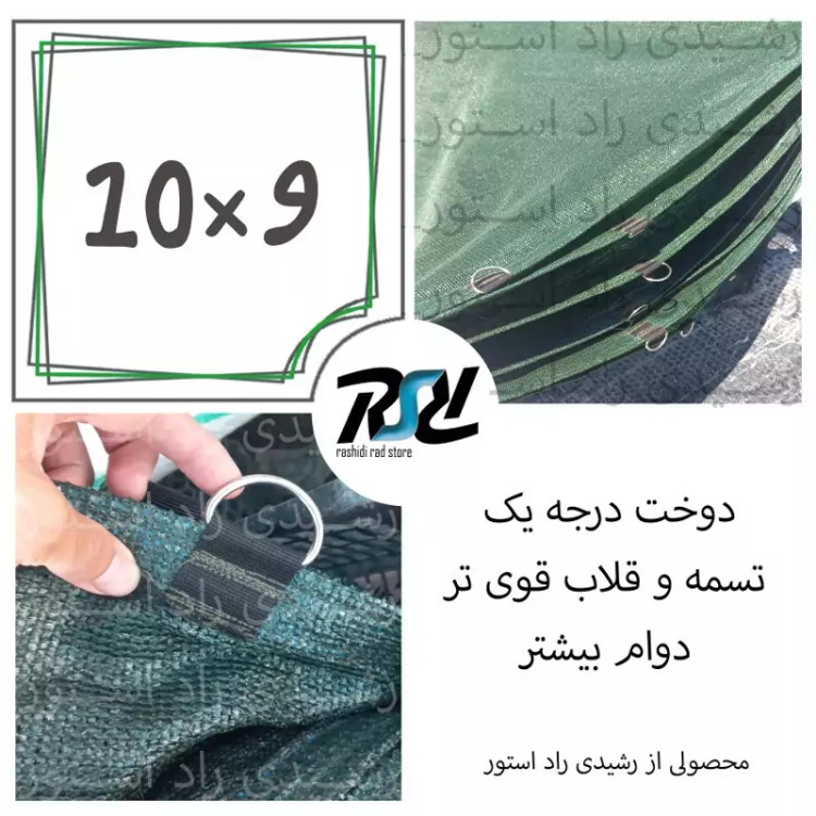 توری سایبان شید، 80 درصد، انتی یووی دار بوده که از اشعه خطرناک خورشید جلوگیری میکند و دربرابر آفتاب مقاومت بالایی دارد. دوخت درجه 1 (منظور تسمه و دوخت بسیار قویتر میباشد)، یک تسمه محکم دورتادور توری، و هر متر یک قلاب با تسمه ثانویه دوخت خورده است. توری سایبان شید، برخلاف برزنت، وزن سبکی دارد و هوا را خف نمیکند، یعنی هوا در جریان هست. همچنین ارزان تر و با دوام تر میباشد. این ابعاد به خاطر بسته بندی بزرگ، هزینه پستی بیشتری دارد، درصورت تمایل ارسال با باربری، پیام بدهید