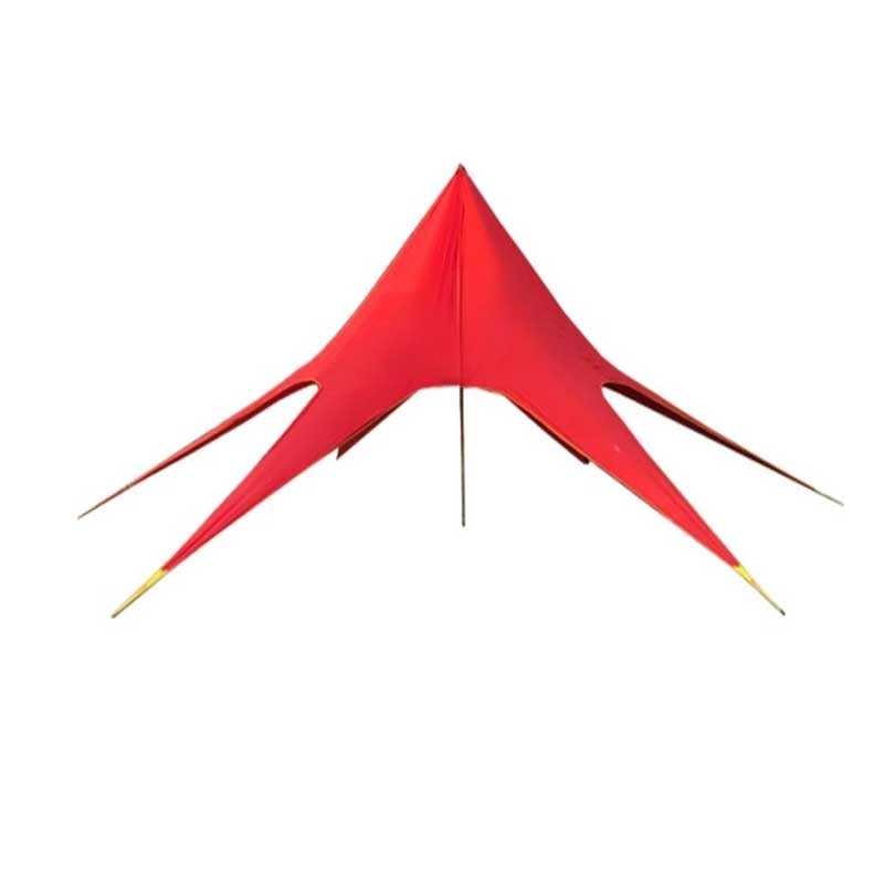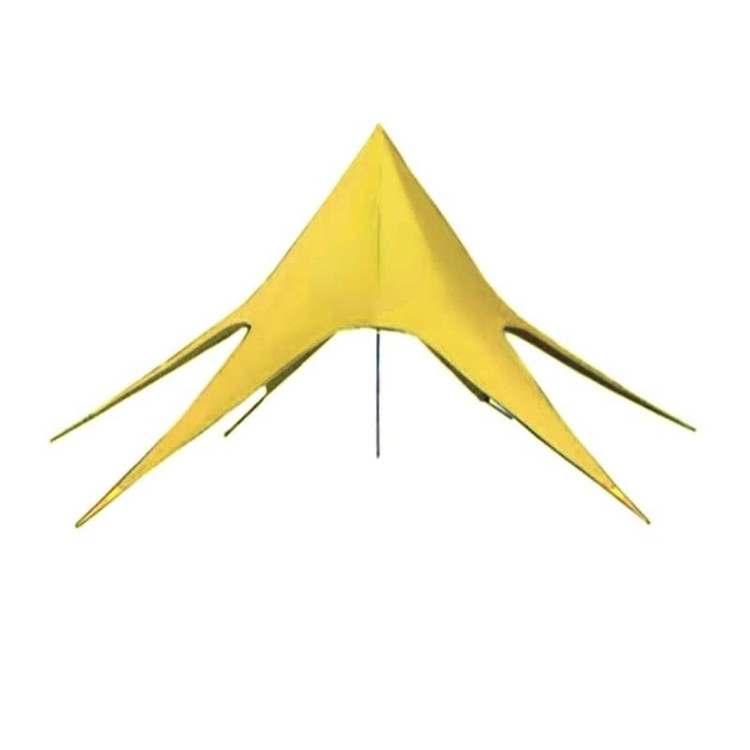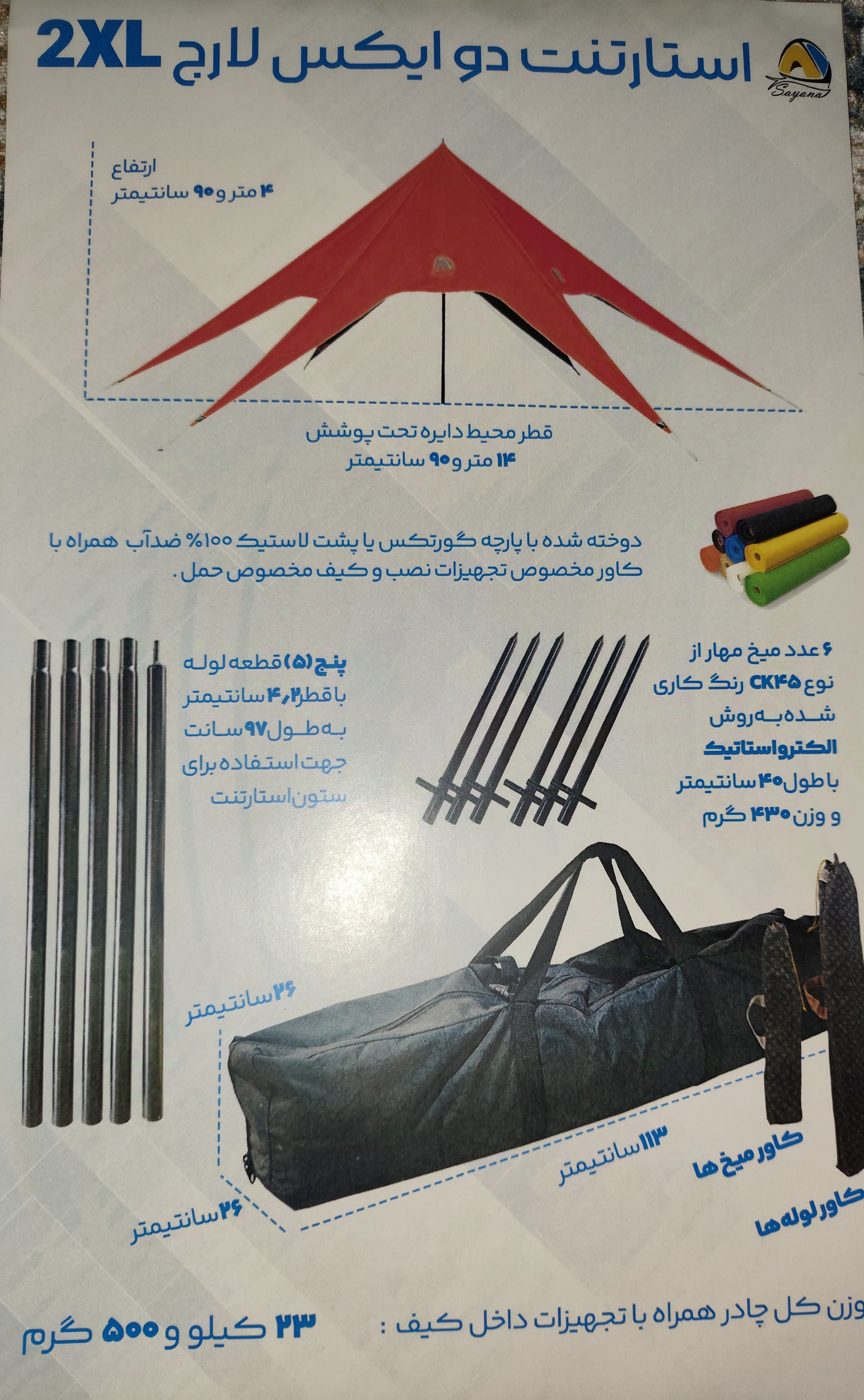 مشخصات سایبان ستاره ای استارتنت سایانا : سایز استارتنت سایز XXL دارای 5 قطعه لوله با ضخامت 4 سانتی متر سایز دوایکس لارج با قطر ۱۴ متر و ۹۰ سانتی متر و ارتفاع ۴ متر و ۹۰ جنس پارچه استارتنت سایانا از پارچه ضد آب گورتکس درجه یک پارچه بافت نخی به عنوان پارچه ضد آب استفاده می شود. دارای ۶ قطعه میخ فولادی و رنگ کاری الکترواستاتیک دارای کیف حمل لوله های ستون و کیف حمل میخ ها و استارتنت